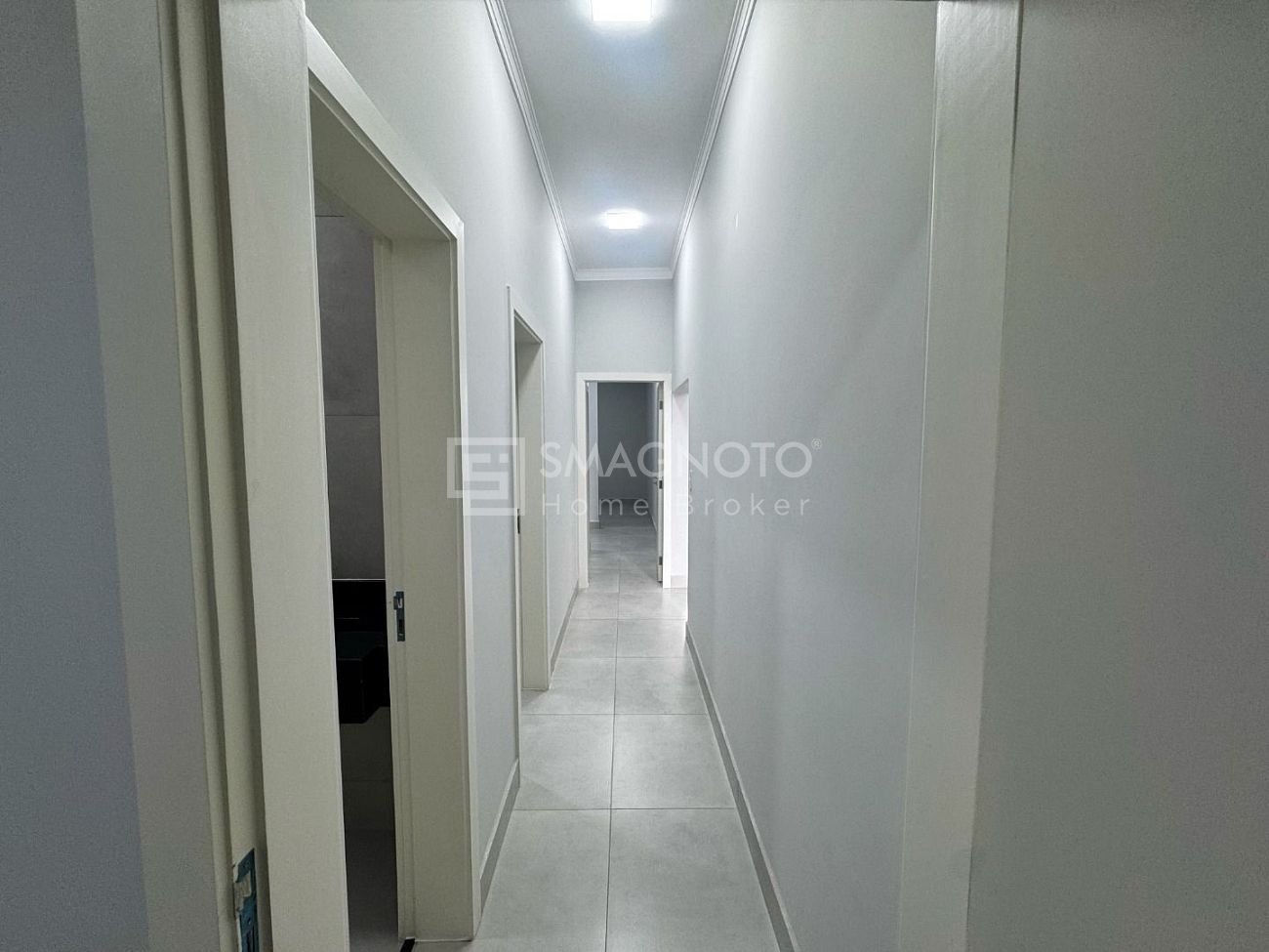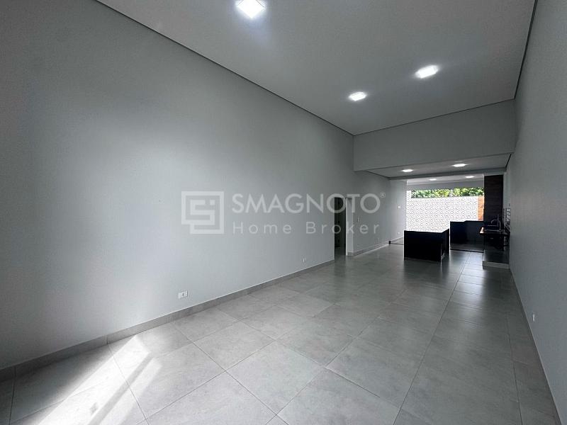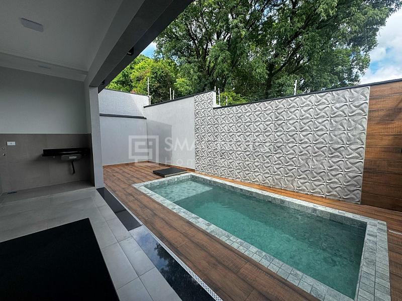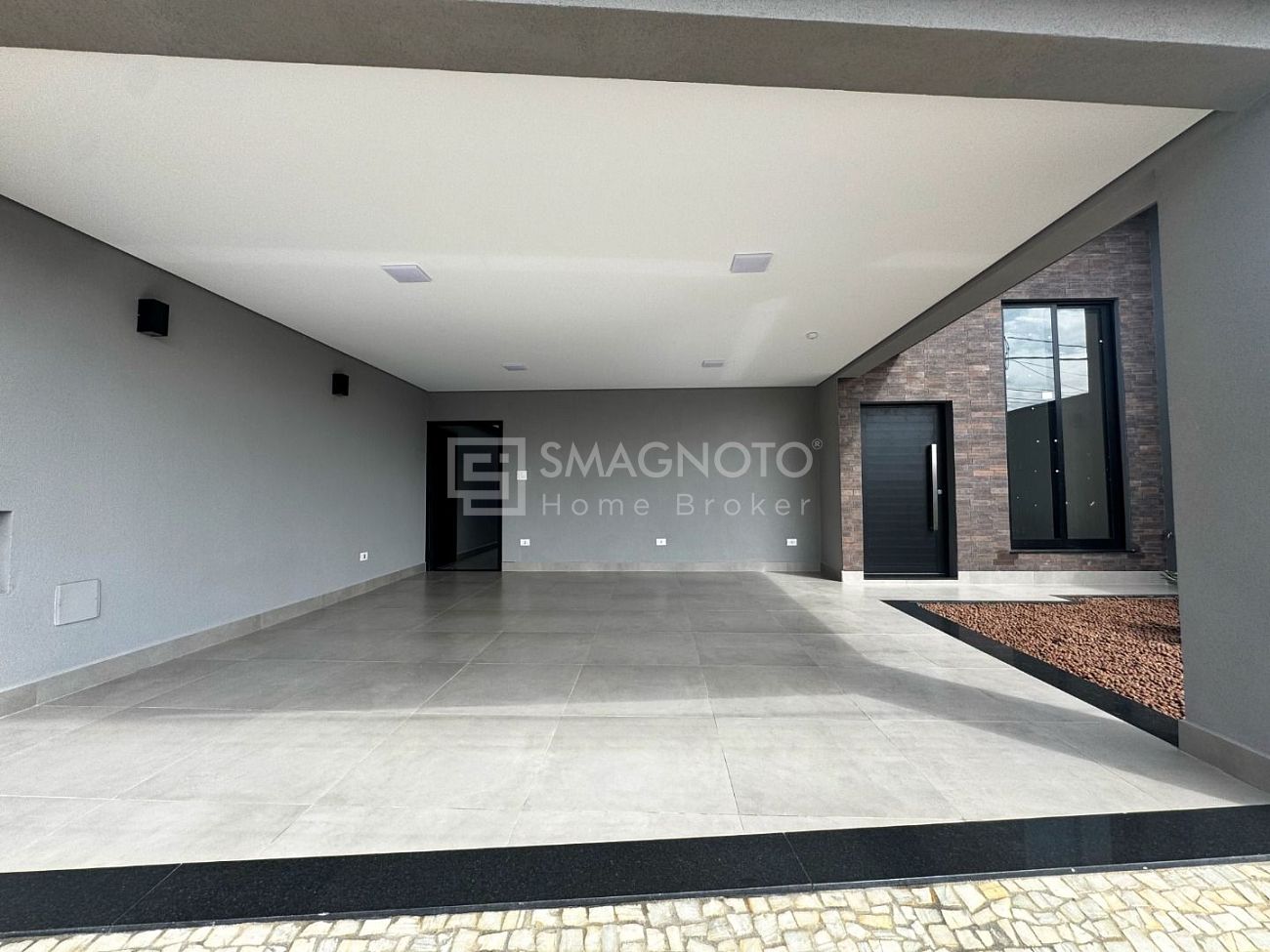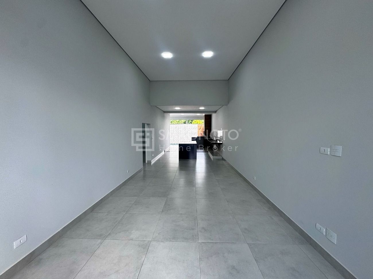 A casa possui uma ampla sala de estar com pé direito de 5 metros, criando um ambiente iluminado e acolhedor. Com três dormitórios, incluindo uma suíte luxuosa com closet e porta de correr que dá acesso ao quintal, o imóvel oferece conforto e privacidade.