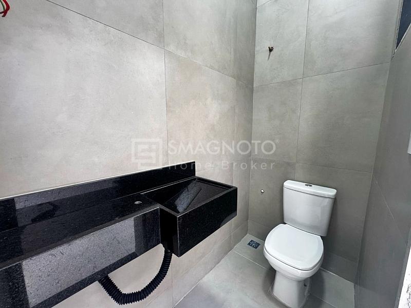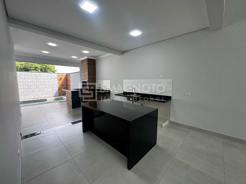 A cozinha gourmet, integrada à sala de estar, conta com uma ilha moderna e acesso à área externa, onde uma charmosa varanda com churrasqueira aguarda para momentos de lazer. Uma lavanderia prática, também integrada, completa a funcionalidade da casa.
