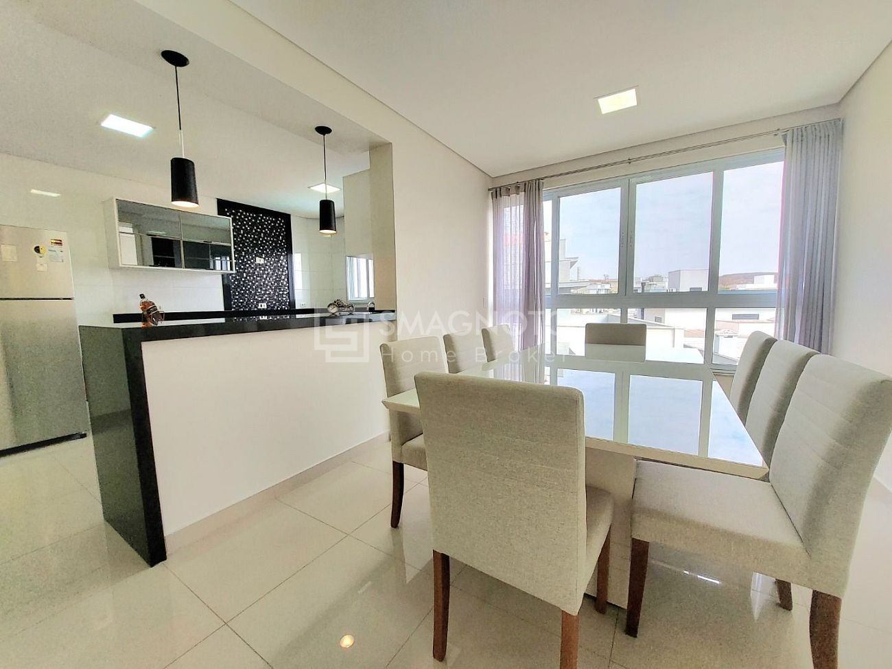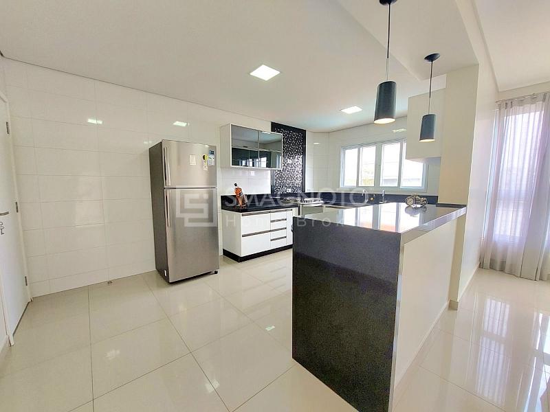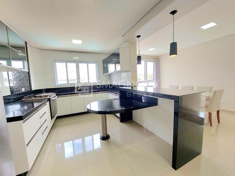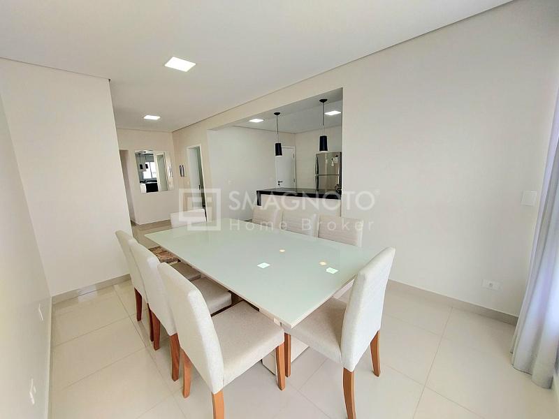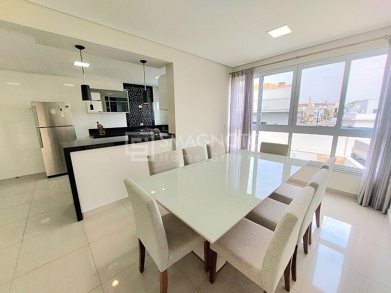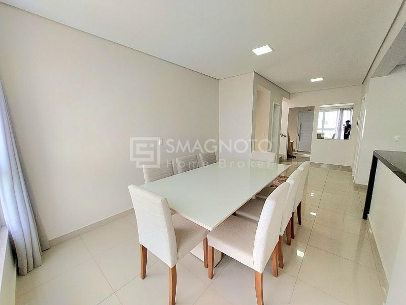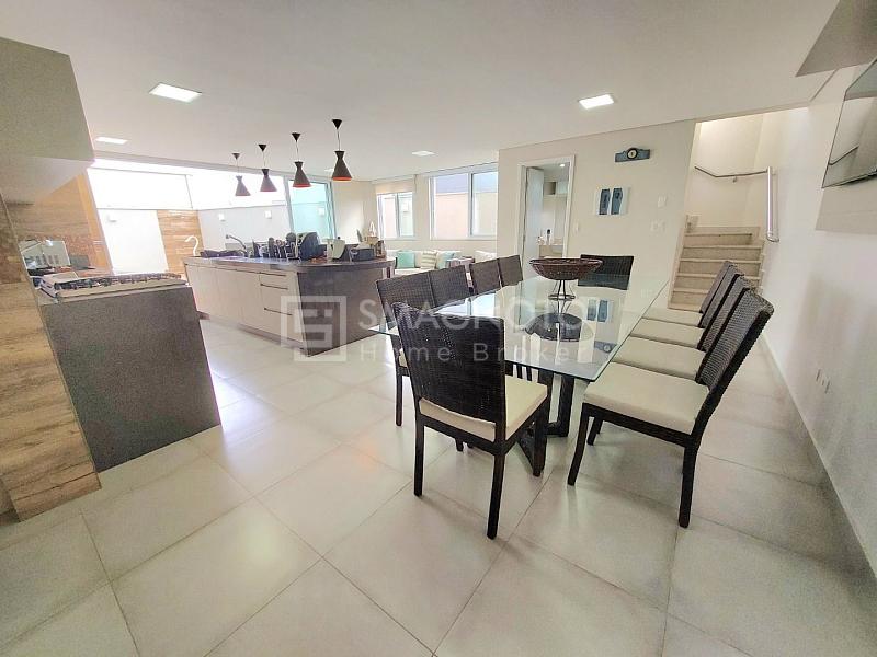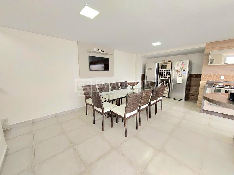 A sala de jantar, integrada à cozinha americana com planejados, proporciona um ambiente harmonioso e funcional para suas refeições diárias.
