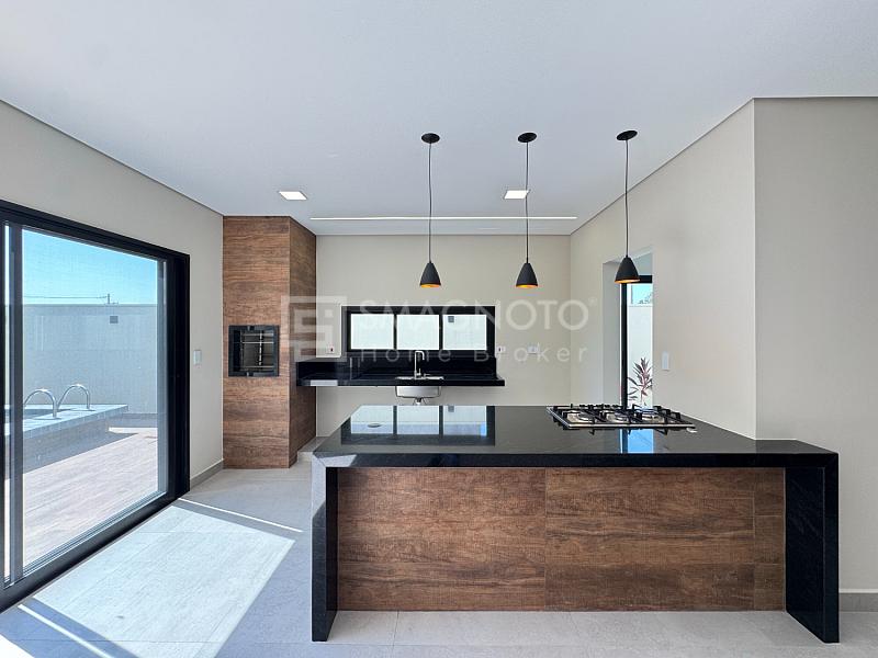 O interior é um convite ao convívio. A sala de estar se integra perfeitamente à cozinha americana e a um espetacular espaço gourmet com churrasqueira a carvão, criando o ambiente ideal para receber amigos e familiares. Para o dia a dia, um home office reservado garante produtividade e privacidade.