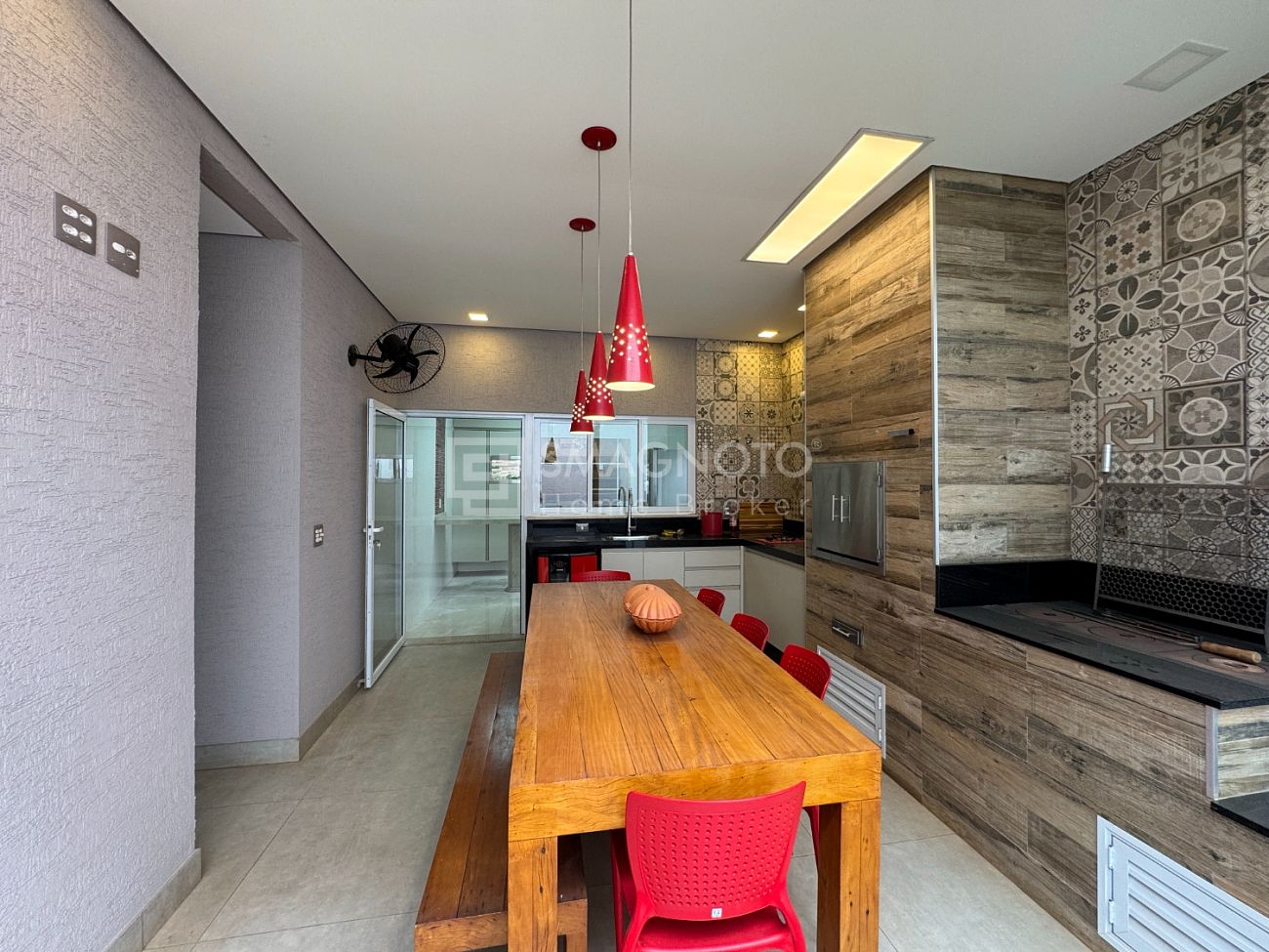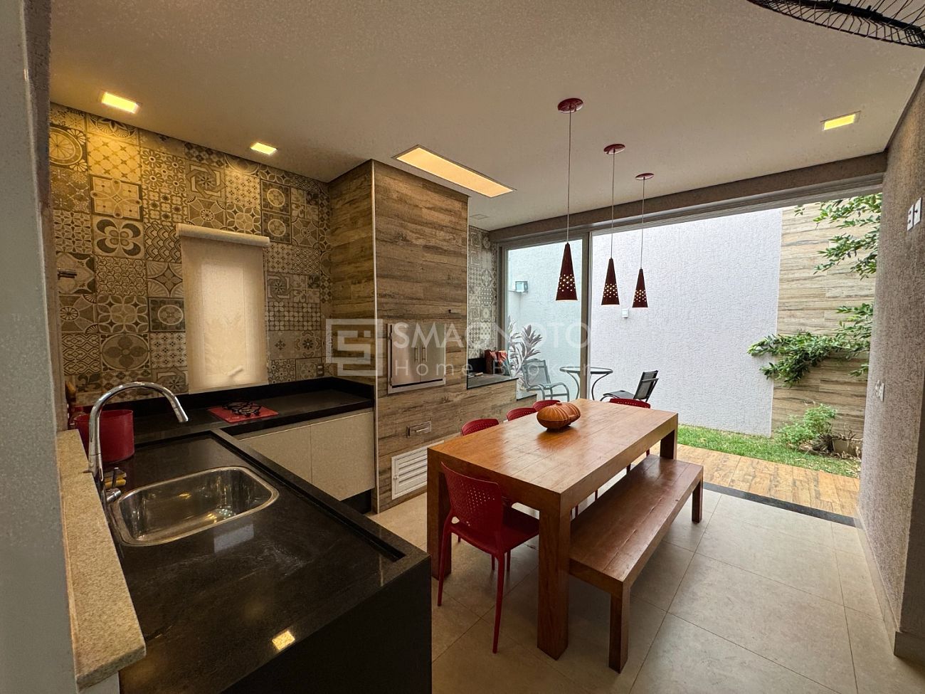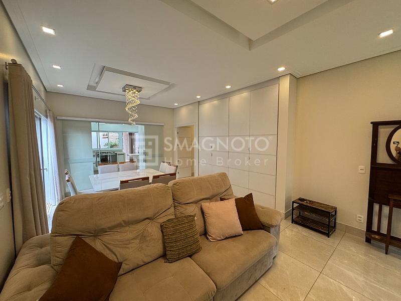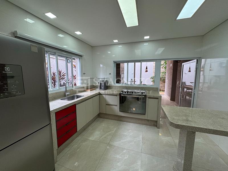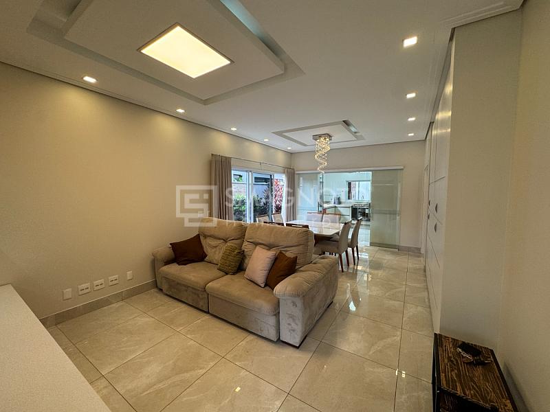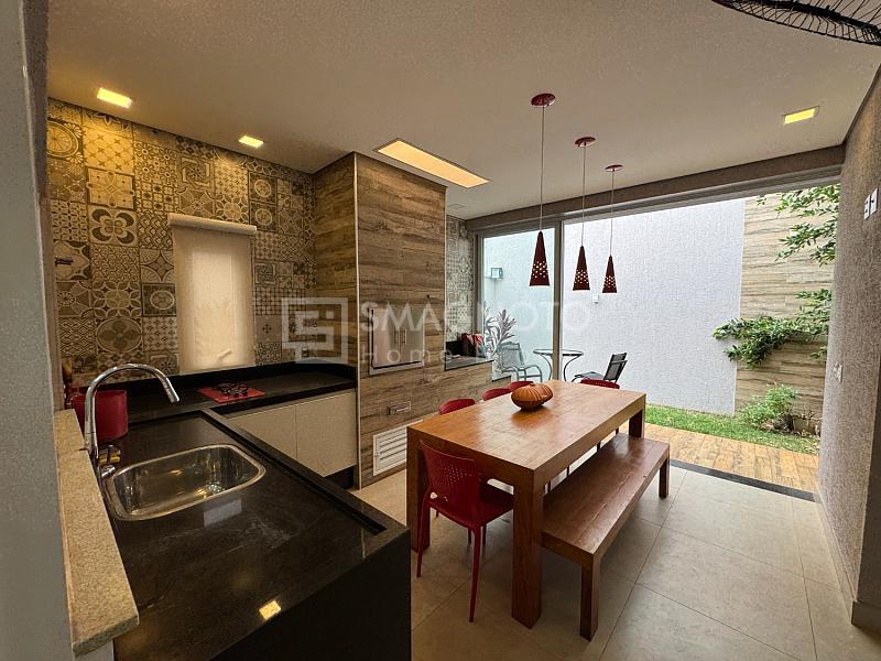 A sala com dois ambientes integrados proporciona amplitude e integração com a cozinha equipada com eletrodomésticos de qualidade. Já a área gourmet com churrasqueira, conectada ao quintal com paisagismo, cria o cenário perfeito para receber familiares e amigos.