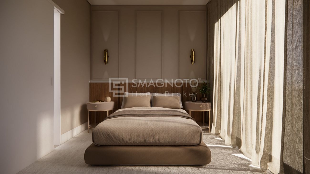 O living é composto por uma sala de estar integrada à sala de TV, que proporciona momentos de convivência com muito aconchego. A cozinha planejada oferece praticidade no dia a dia, enquanto a área de serviço garante organização e funcionalidade. No pavimento social, um lavabo completa o ambiente com charme e requinte.