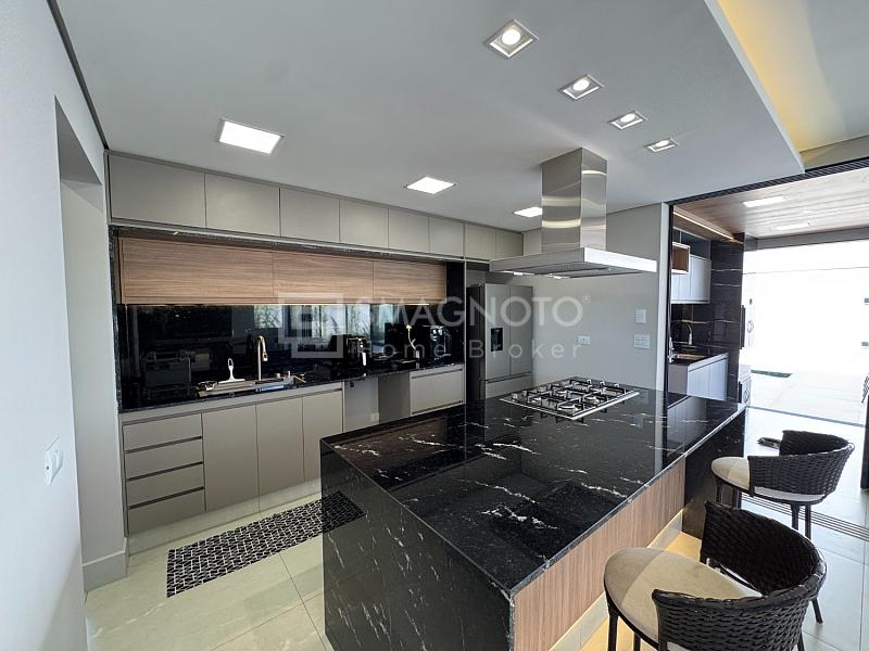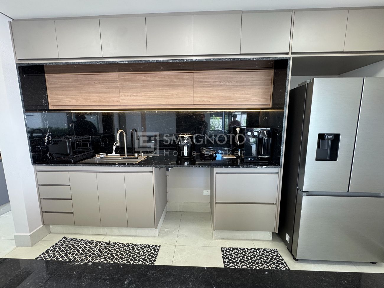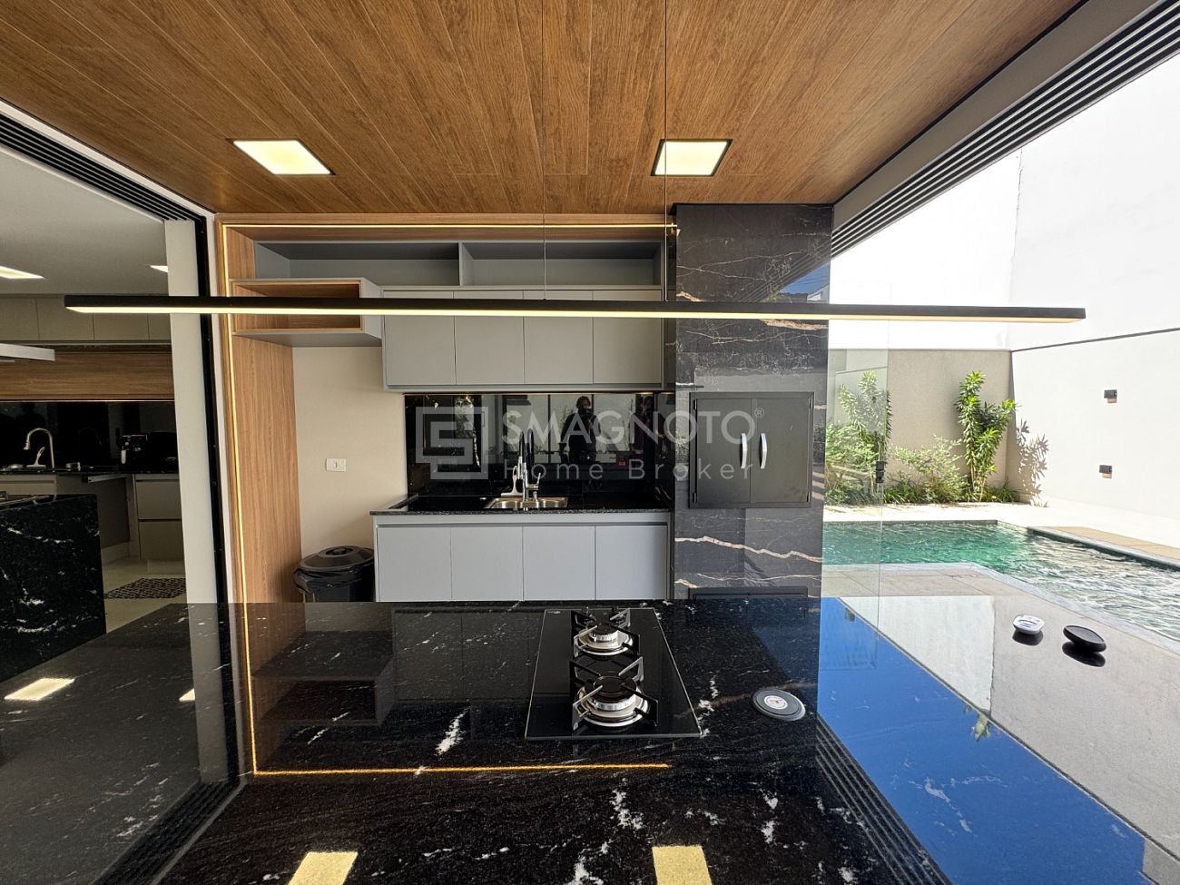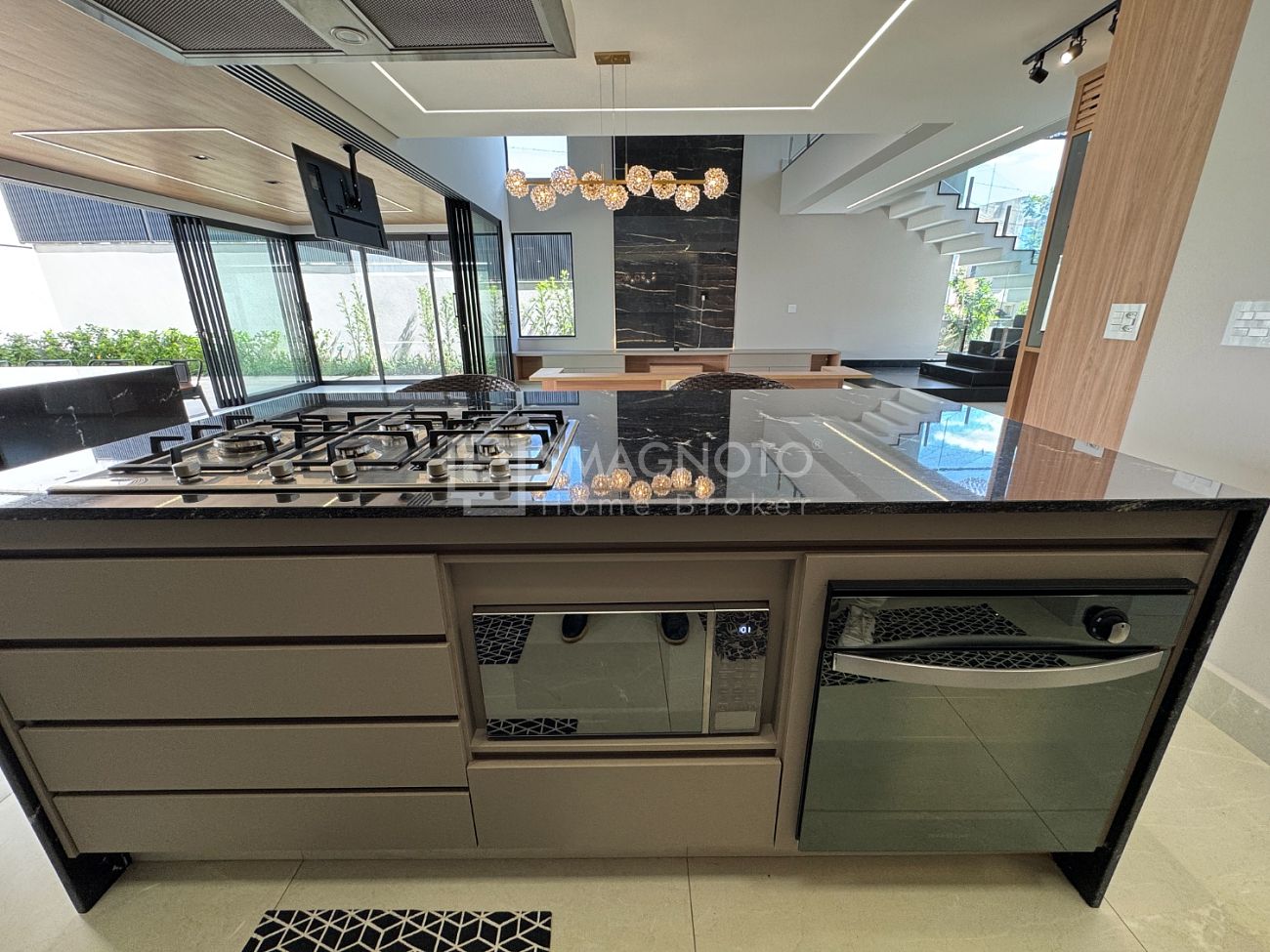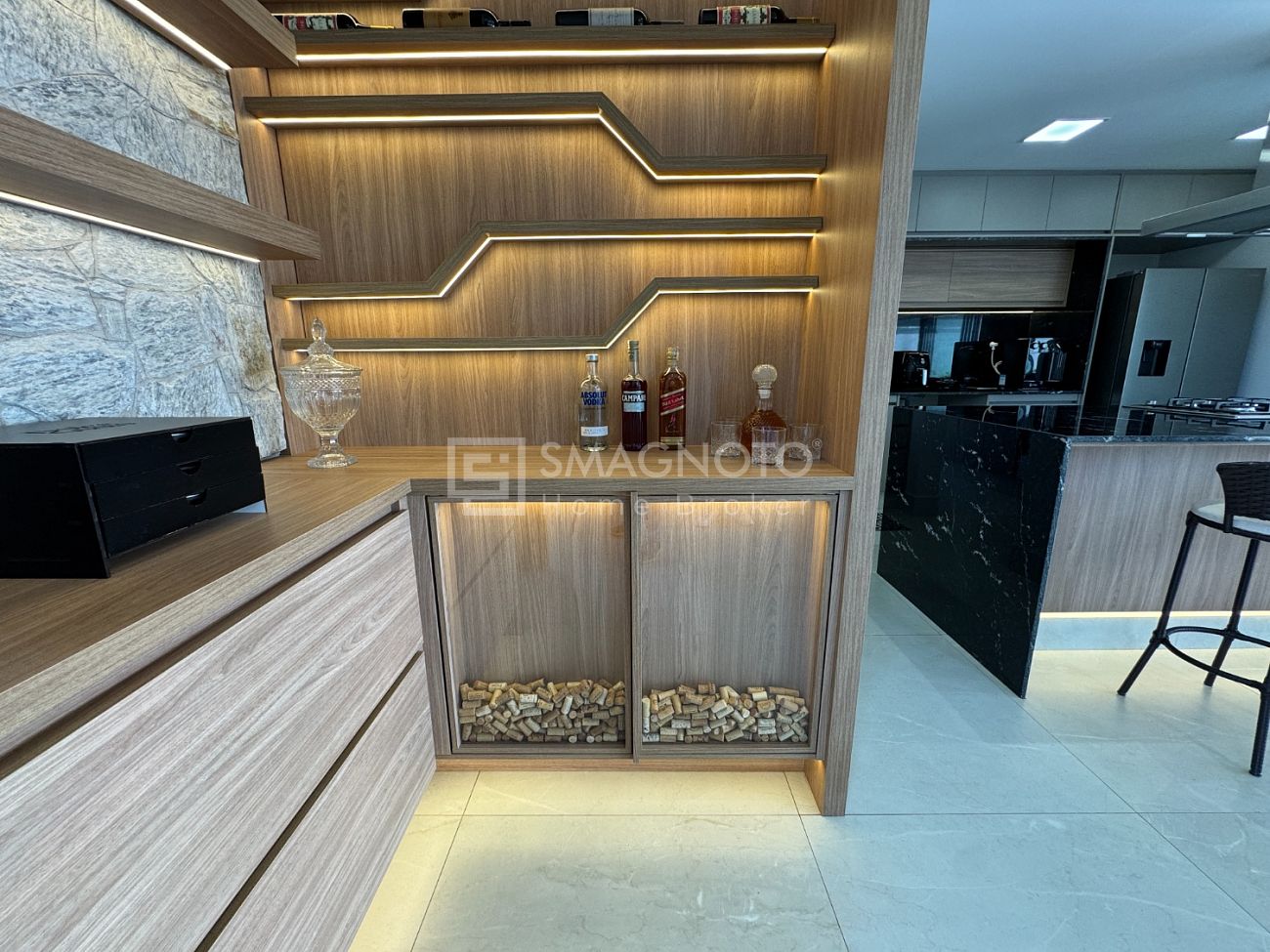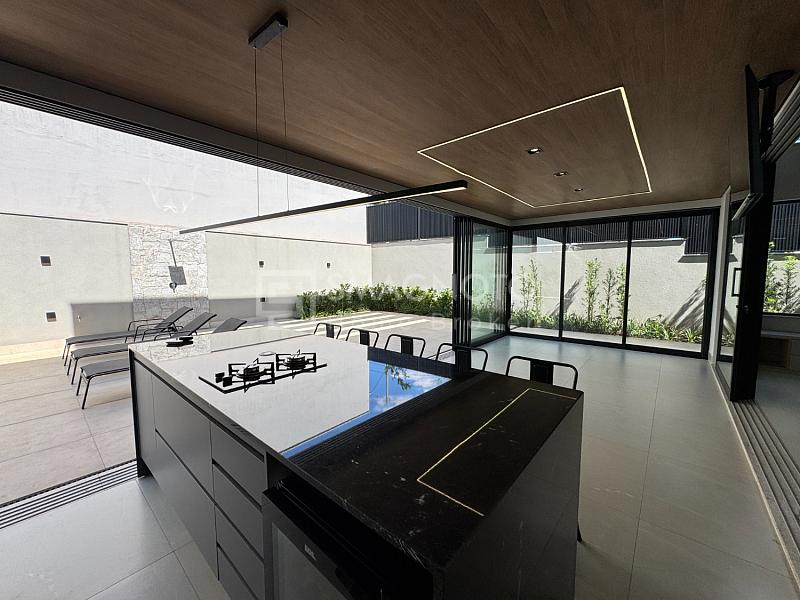 No piso térreo, a sala com pé-direito duplo convida à contemplação e se integra com leveza à cozinha com ilha central, à adega e ao espaço gourmet com parrilla argentina, ideal para receber com elegância.