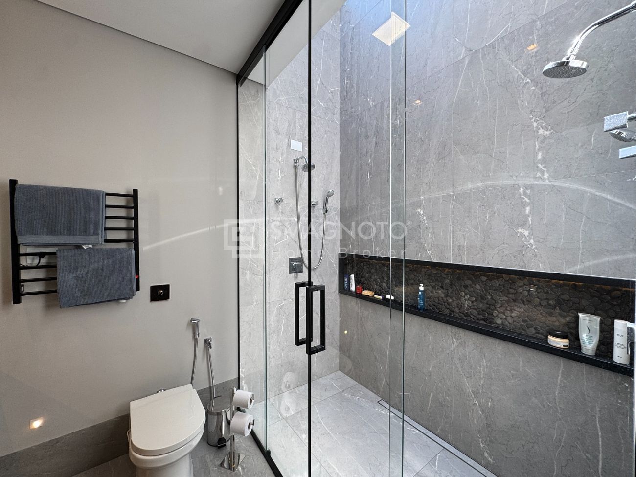 Para momentos de lazer, a área externa revela um cenário encantador, com piscina iluminada, spa e sauna úmida integrada com cascata, criando uma experiência única de relaxamento e contemplação.