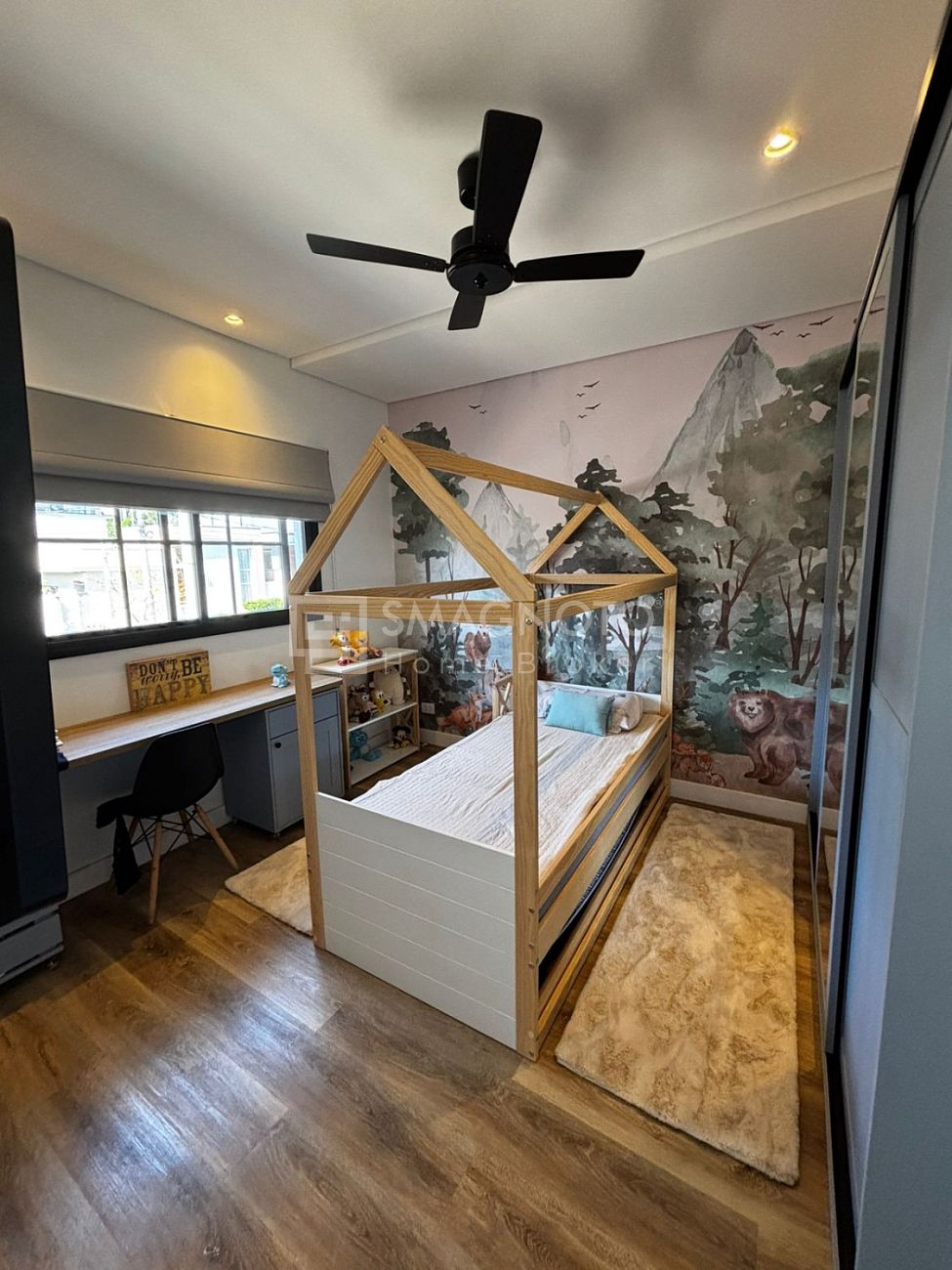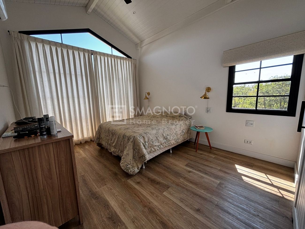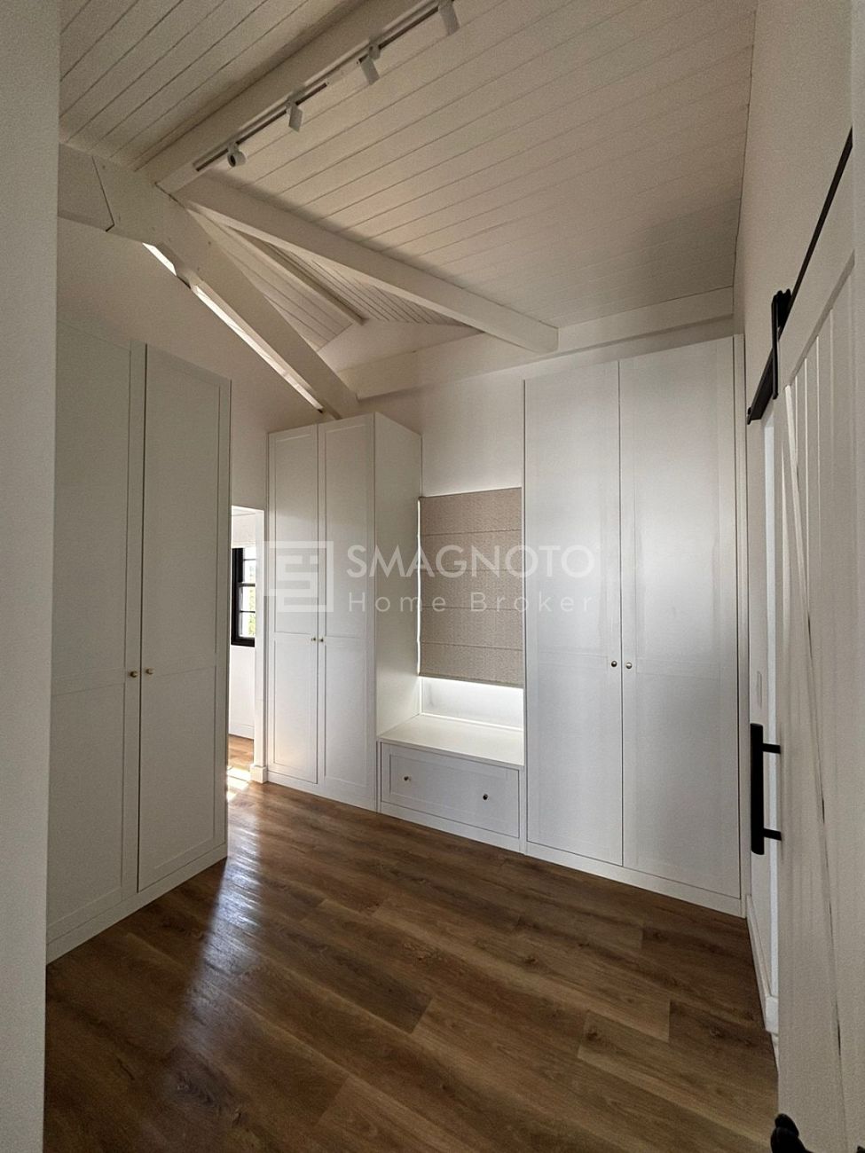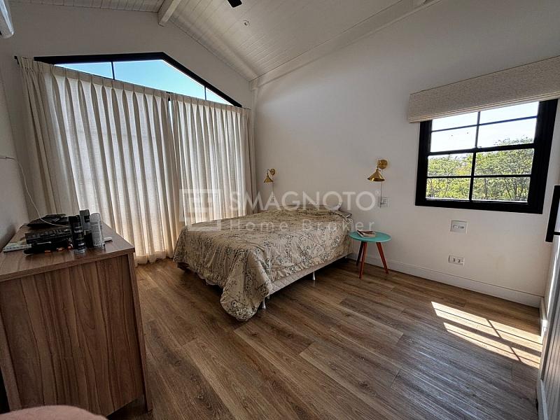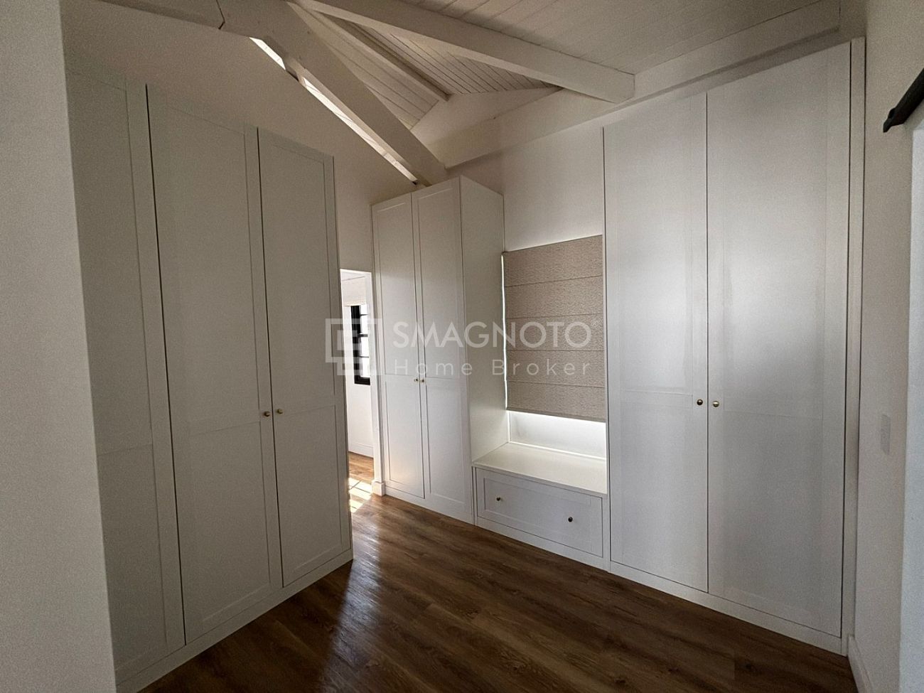 No piso superior, a área íntima dispõe de 3 suítes cuidadosamente planejadas. Uma delas com armário embutido, papel de parede e ar-condicionado. A suíte máster é um verdadeiro refúgio, com closet no estilo catedral, portas de correr, ar-condicionado e terraço envidraçado.