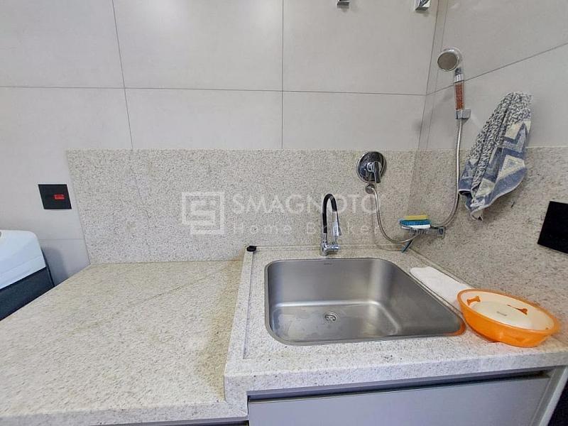 A lavanderia não é apenas funcional, mas também possui um espaço pet, com ducha e uma bancada em granito.